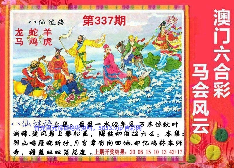 | 337期:【八仙过海】 【阴山鸣雁晓断竹,月宫章有闲田地,却亿鸡林本师寺,檐燕双双落花度】 解:意思是闲田地解出地肖蛇羊鸡虎狗鼠,林解出木肖虎兔 生肖:虎狗猪猴牛鸡 |
