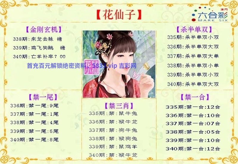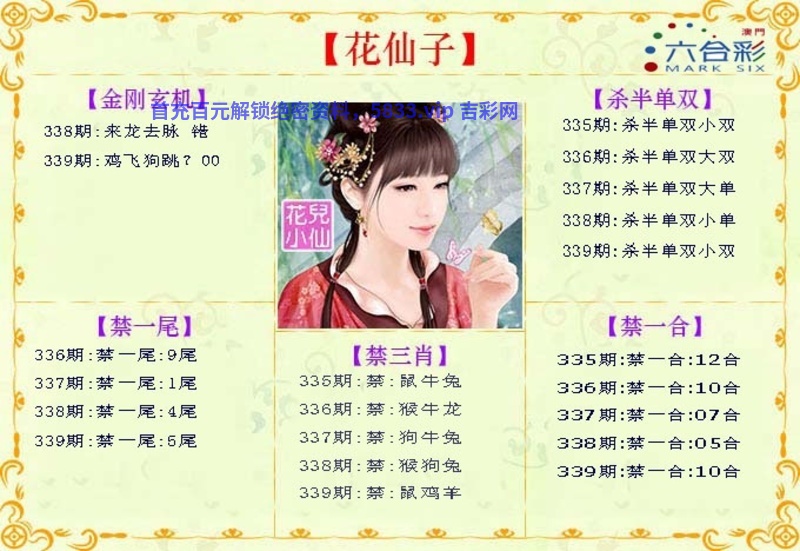 | 340期:【八仙过海】 【御沟春水绕闲坊,两三杯洒自寻盟,六花大似天边雪,算自古谁如此君】 解:意思是春水解出春肖虎兔龙,水解出水肖鼠猪,君解出君王的生肖虎龙 生肖:虎猪龙马狗兔 |